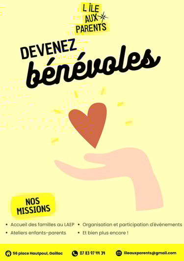 Devenir bénévole au sein de notre association, c'est l'opportunité de faire une réelle différence dans la vie des enfants et de leurs familles. En créant des activités enrichissantes et en offrant un espace d'accueil chaleureux, vous contribuerez à bâtir une communauté solidaire et joyeuse. Rejoignez-nous et partagez votre passion, votre temps et votre énergie pour illuminer le quotidien des plus jeunes et soutenir les parents dans leur parcours. Ensemble, nous pouvons créer des souvenirs inoubliables et un impact durable !
