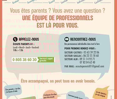 Depuis le 18 septembre 2023 et en partenariat avec l’EPE d’Albi ainsi que la CAF, nous assurons un accueil téléphonique appelé « point écoute parents du Tarn » les lundis, mardis, jeudis et vendredis de 10h à 13h.
